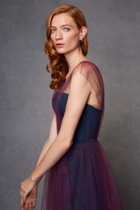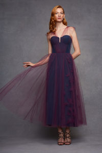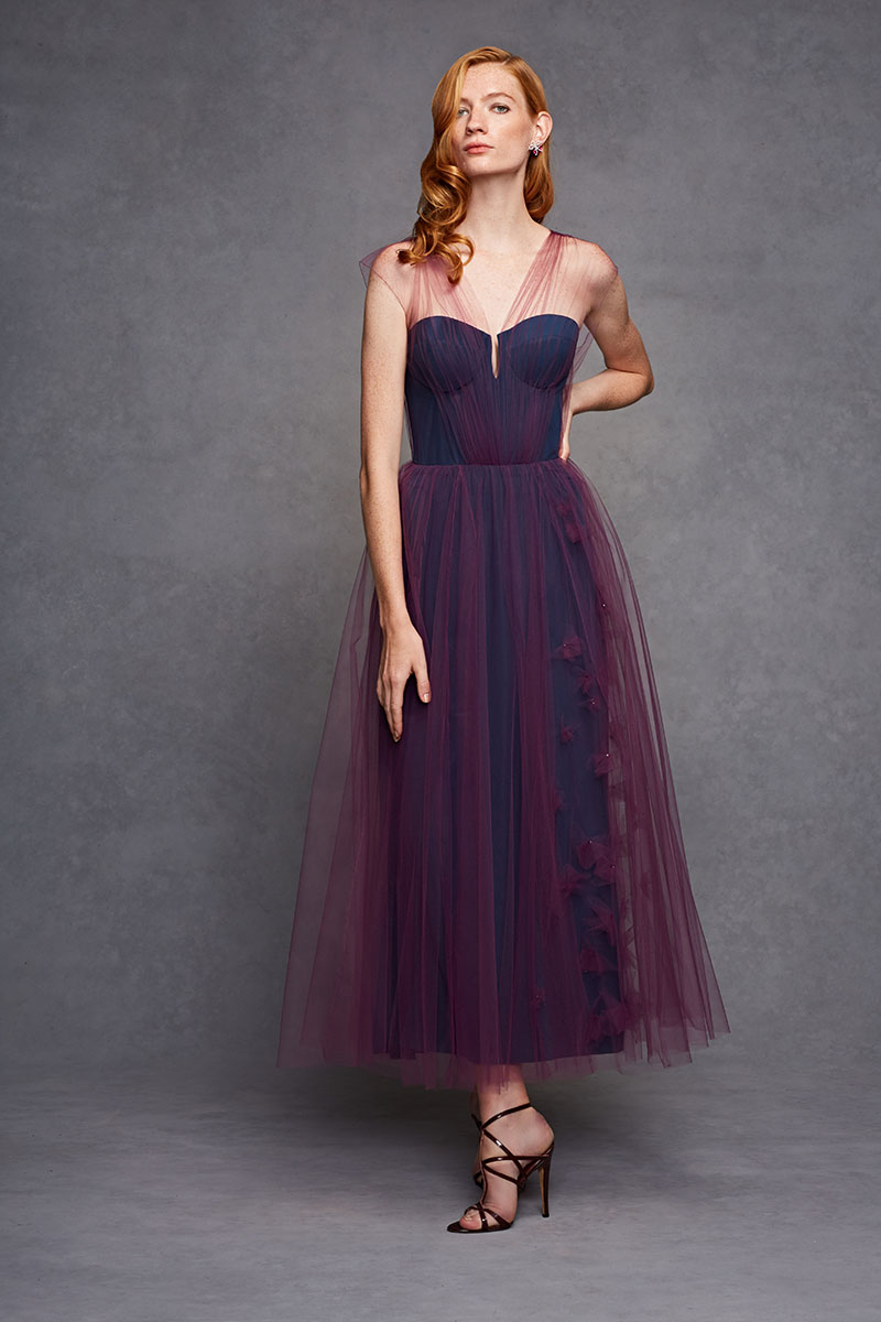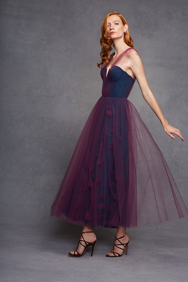 Look 23. Ankle length silk crepe de chine gown with tulle overlay, origami butterfly detail applique. Full bustier construction.