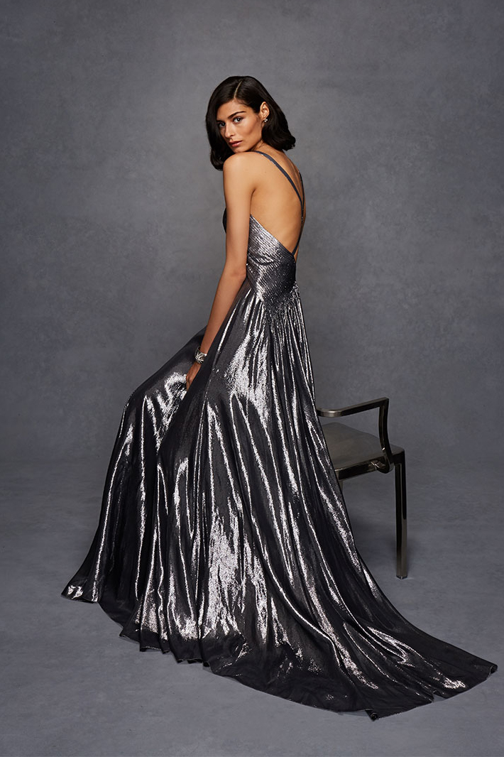 Look 18. Fitted halter gown with hand tucking detail in silk blend liquid lame.