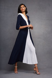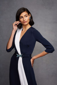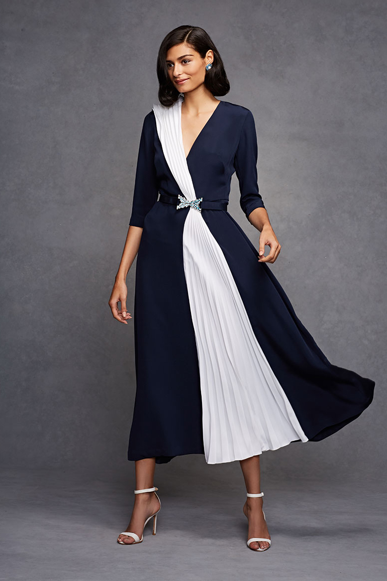 Look 13. ¾ Sleeve V neck ankle length dress with engineered sunburst pleating in 100% four ply silk crepe. Available with novelty butterfly clasp belt or self belt.