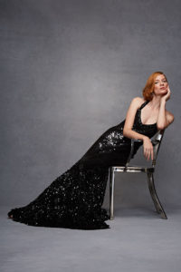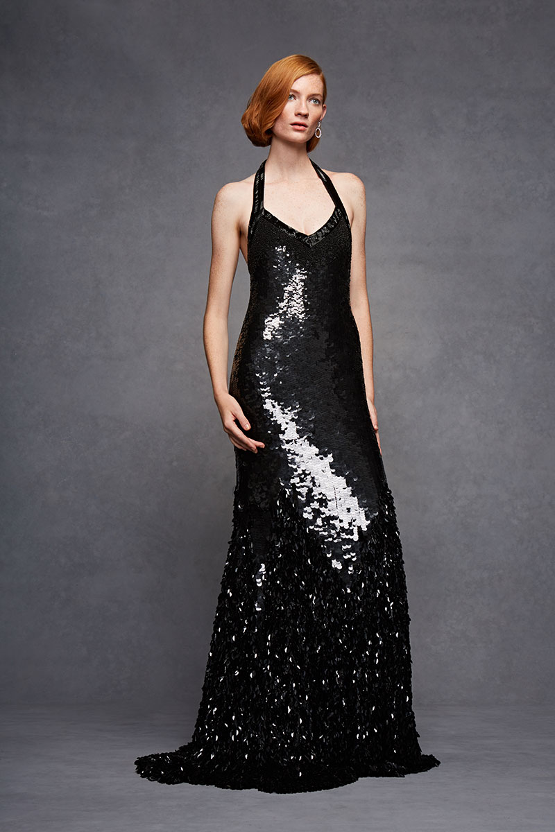 Look 21. Long halter gown with godet inserts, fully beaded in graded sequins with greek key detailing at neckline.