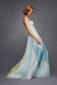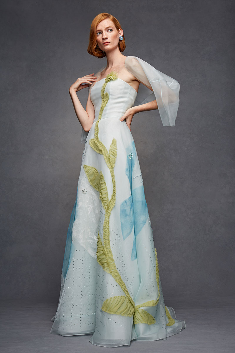 Look 29. Strapless gown with hand-painted and embroidered detailing, Swarovski crystal applications, in 100% silk organza. Available with a seamed bolero cover up in 100% silk organza.